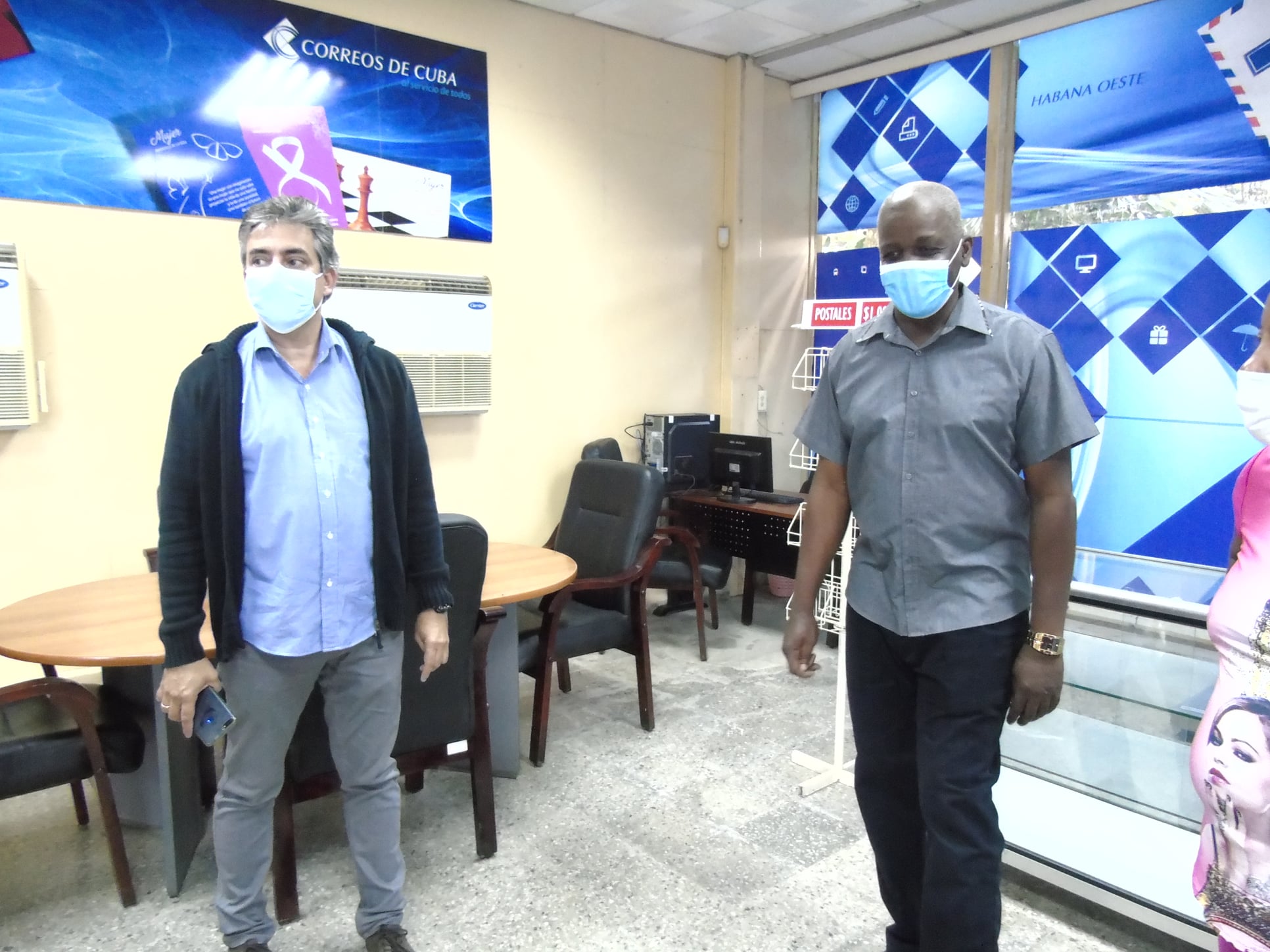 En diálogo con Lázaro Manzano Zamora, director general de la Empresa de Correos Habana Oeste; Regla Molina Montes, directora de Correos del municipio Boyeros; y José Manuel Valido Rodríguez, director de Comunicación Institucional de la organización postal, el viceministro primero del MINCOM reconoció la calidad de la nueva imagen y de los trabajos realizados en la única unidad de correos con que cuenta Expocuba; y supo de las ofertas y servicios, incluidos los de comercio electrónico, que se ofrecerán en esa instalación, que ya está lista para recibir a los visitantes del principal recinto ferial de #Cuba.